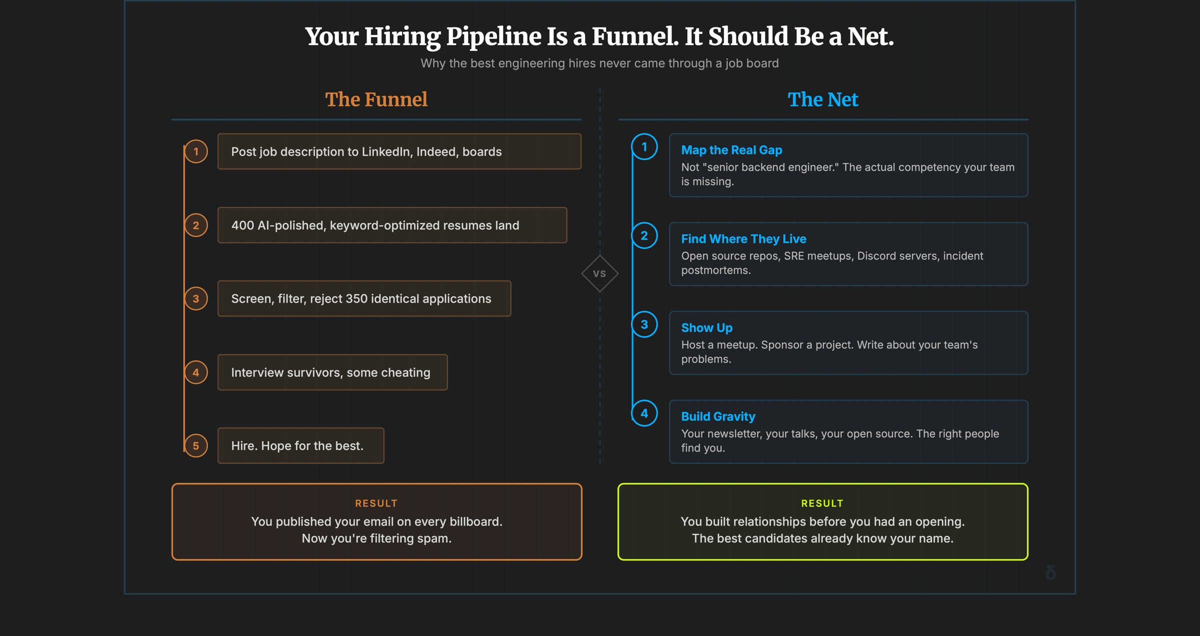 The δeltas newsletter March 31st Your Hiring Pipeline Is a Funnel. It Should Be a Net. ↓ I was sixteen years old when I got my first job in tech. I didn't apply anywhere. I didn't have a resume. I uploaded some code I'd written to a BBS. A Bulletin Board System. Kind of like GitHub in the early 90s. It was a bump-mapping effect written in C. A few days later, the home phone rang. Landline. Family line. A guy named Pavel was on the other end. He was expanding a demo-scene team. Two graphic...